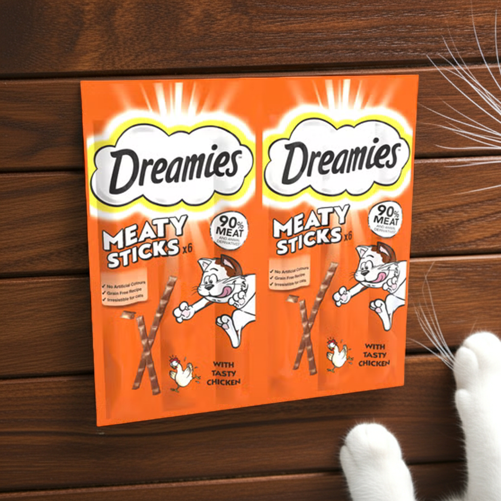 Get ready to add a serious boost of excitement to your cat’s day! DREAMIES™ Meaty Sticks are the irresistible, soft, and savory treats designed to satisfy your feline's instinctual craving for meat. With a huge 90% meat and animal derivatives in every stick, these flexible treats are rich in flavor and perfect for rewarding, playing, or simply showing them some love.