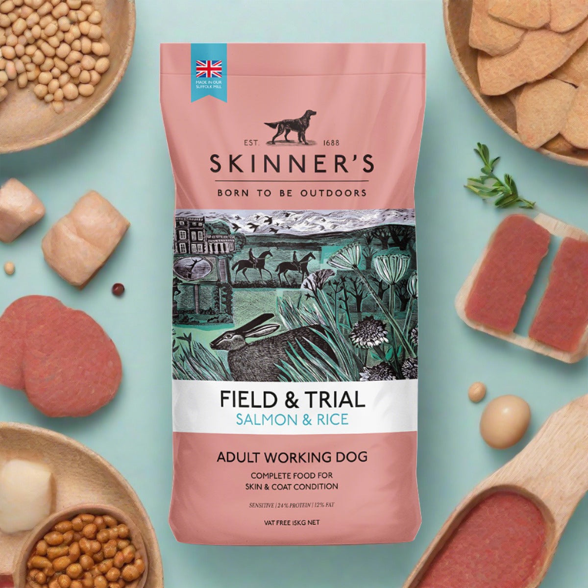 Skinner’s Field & Trial Salmon and Rice is a complete working dog food. This dry food recipe has been developed and formulated to support active dogs who are regularly working at a moderate activity intensity. Part of our sensitive range for dogs with sensitivities and/or dietary intolerances.